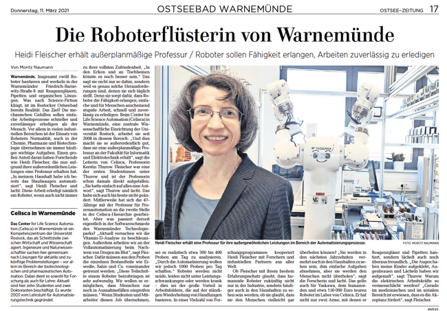 Denn sie sorgt dafür, dass Roboter die Fähigkeit erlangen, einfache und für Menschen anscheinend stupide Arbeit, schnell und zuverlässig zu erledigen. Beim Center for Life Science Automation (Celisca) in Warnemünde, eine zentrale Wissenschaftliche Einrichtung der Universität Rostock, arbeitet sie seit 2008 in diesem Bereich. „Und dies macht sie so außerordentlich gut, dass sie eine außerplanmäßige Professur an der Fakultät für Informatik und Elektrotechnik erhält“, sagt die Leiterin von Celisca, Professorin Kerstin Thurow.